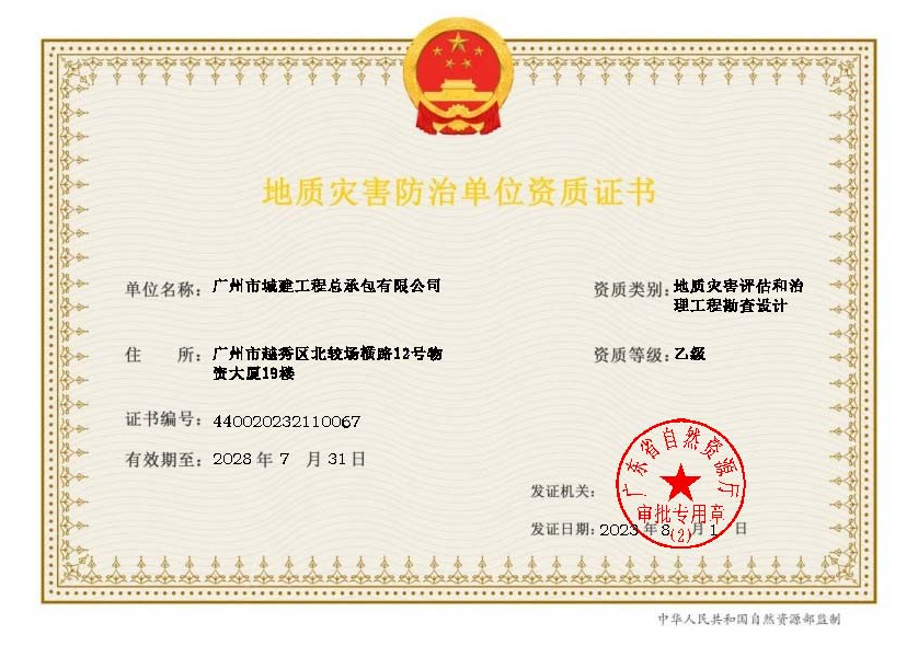 2023年8至10月,公司成功獲批地質災害治理工程施工乙級、監理乙級、地質災害評估和治理工程勘查設計乙級資質。